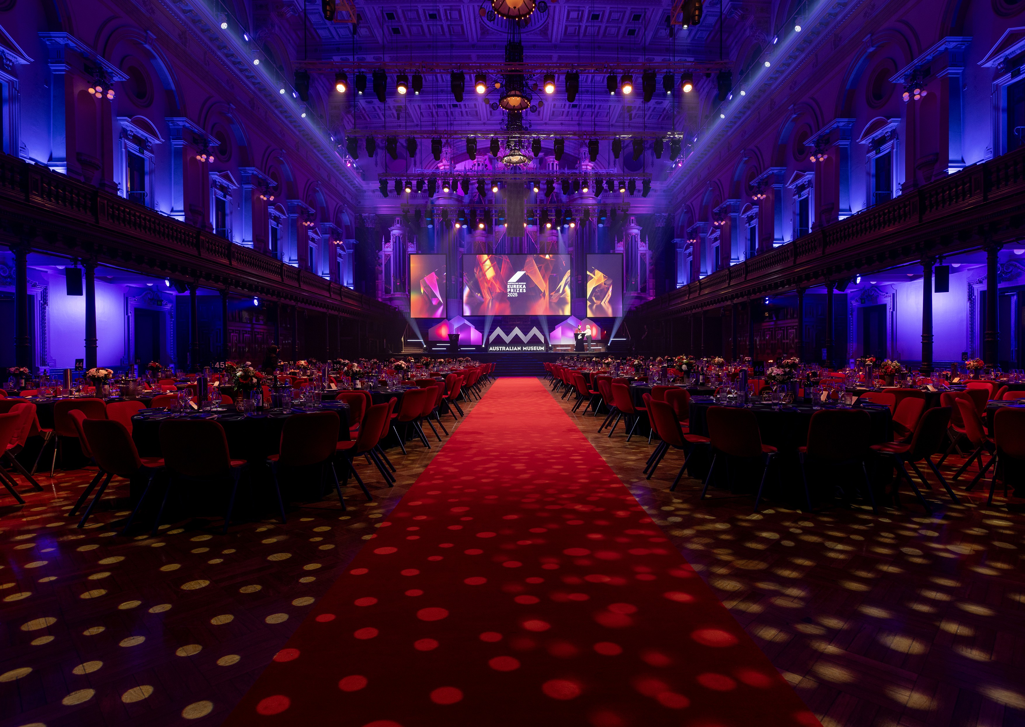 Working directly with the Australian Museum, and in collaboration with event producers Fourth Wall and technical production by Scene Change, TMC delivered a striking visual identity built around abstract sculptural forms. Illuminated in vibrant pinks, purples and oranges against a deep black backdrop, reflective surfaces and bold colour created a memorable and sophisticated aesthetic for the awards.